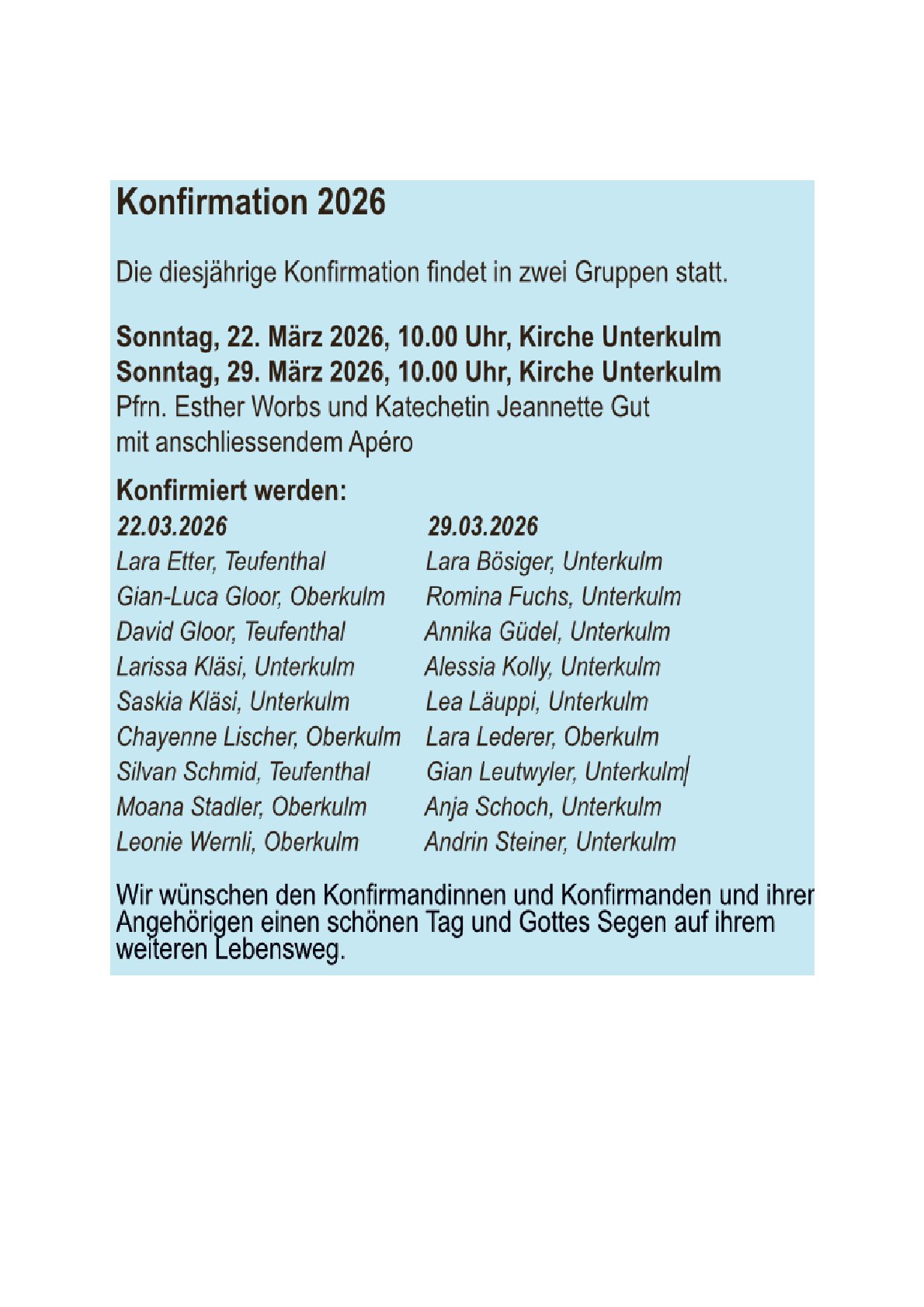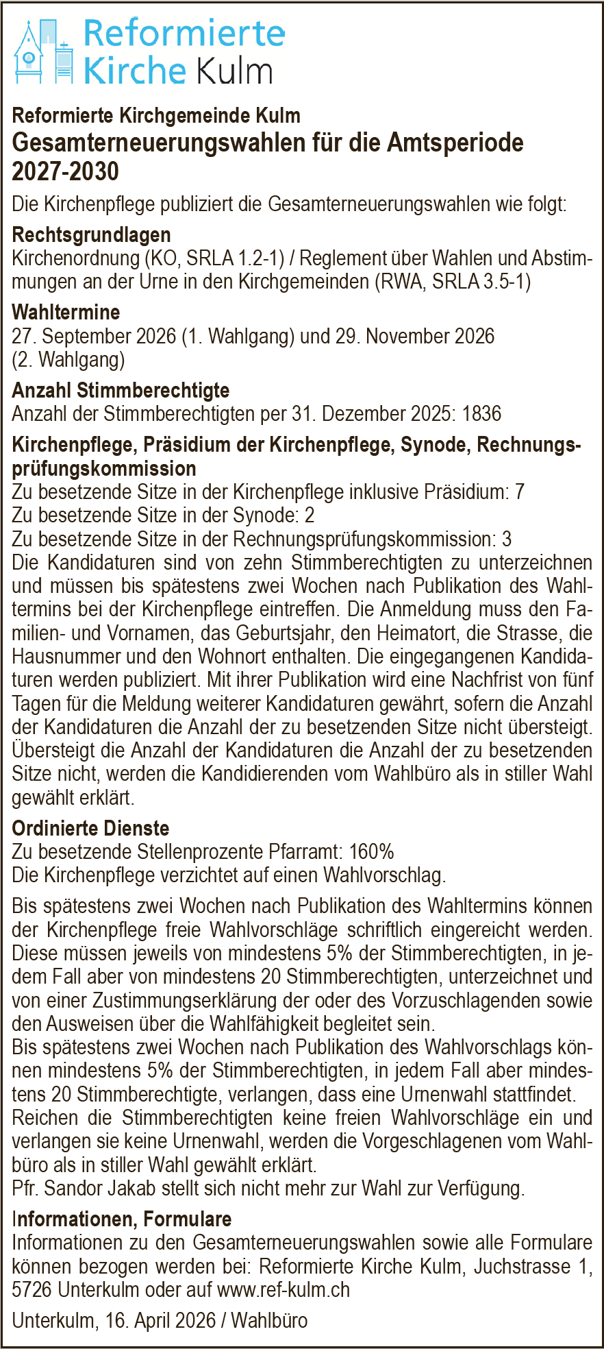 Weitere Informationen erhalten Sie wöchentlich im Wynentaler-Blatt und der Aargauer Zeitung, sowie monatlich in den drei Dorfheftli und auf der Gemeindeseite "Chelezyt" der Zeitung „reformiert". Für weitere Auskünfte stehen Ihnen auch das Pfarramt und das Sekretariat in Unterkulm gerne zur Verfügung.